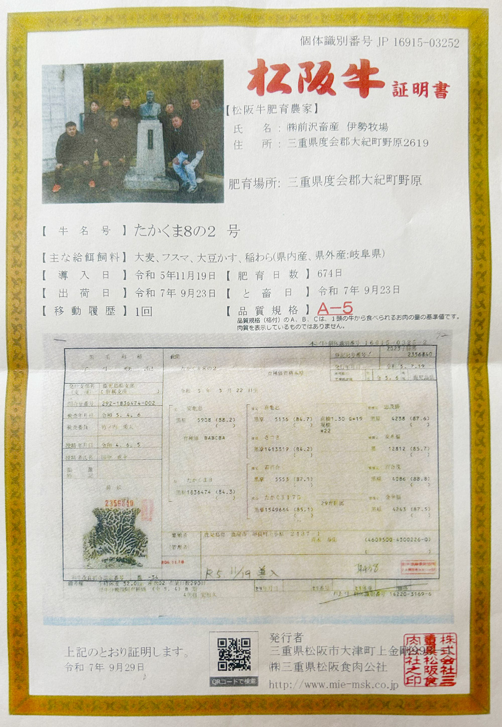 今回入荷したA5ランク松阪牛の証明書と写真です♪